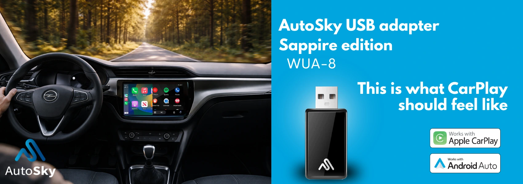 The AutoSky WUA-8 converts wired Apple CarPlay and Android Auto to a wireless connection. A compact CarPlay dongle that simplifies...