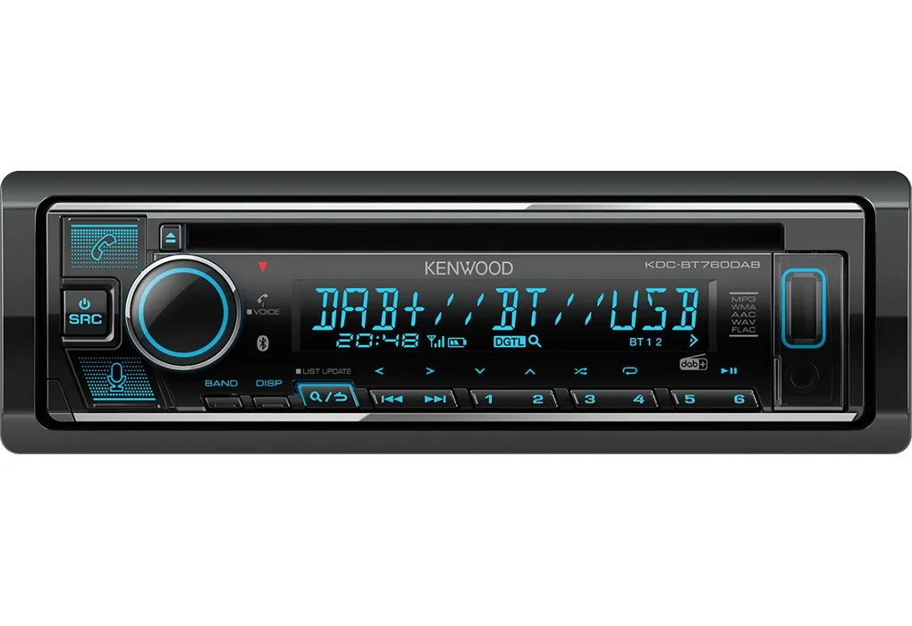 The Kenwood KDC-BT760DAB is a 1-DIN car radio with CD drive and DAB+ digital radio. Listen to interference-free radio, make hands-free calls, and stream music via Bluetooth. Play music via CD, USB or AUX and enjoy clear FM sound with RDS.