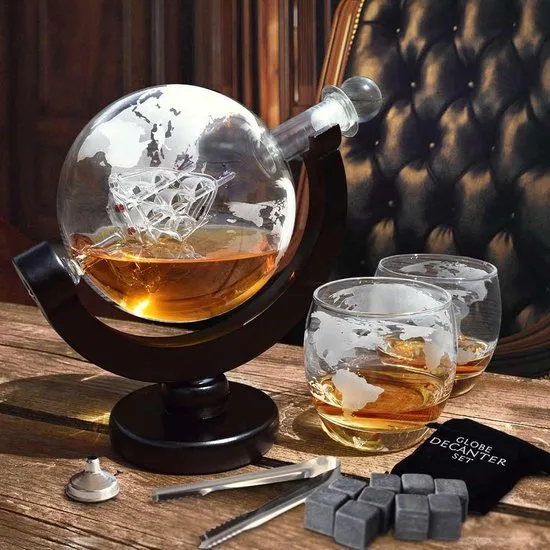 Deze elegante globe decanteerset combineert functionaliteit met een nautisch ontwerp. De set bevat een glazen karaf in de vorm van een wereldbol, twee bijpassende glazen en een houten standaard. Ideaal voor het serveren van whisky, rum, cognac of gin.